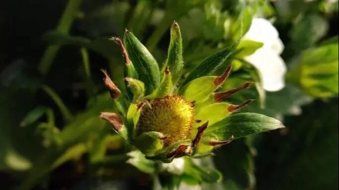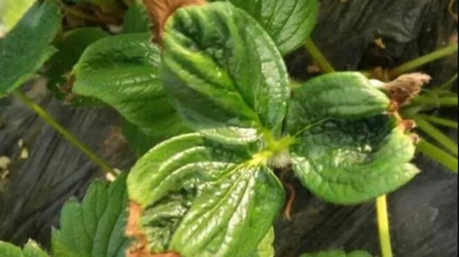 ▲草莓缺钙引起的花叶尖部灼烧状