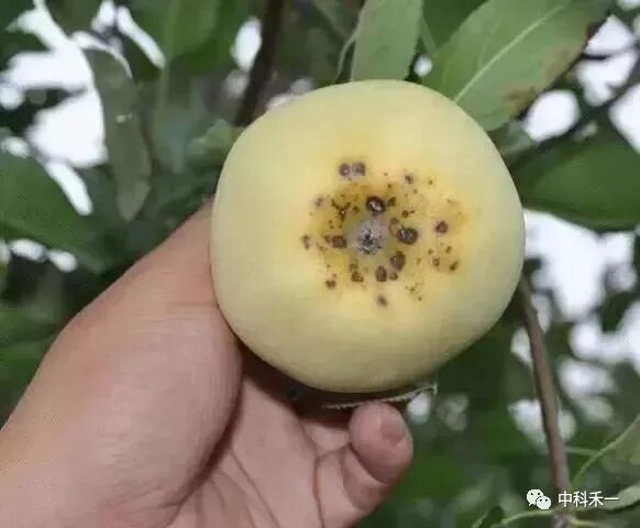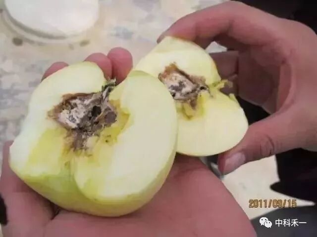 主要表现在果实上,多在果心部发病,外观表现正常,需将果实切开才可识别。