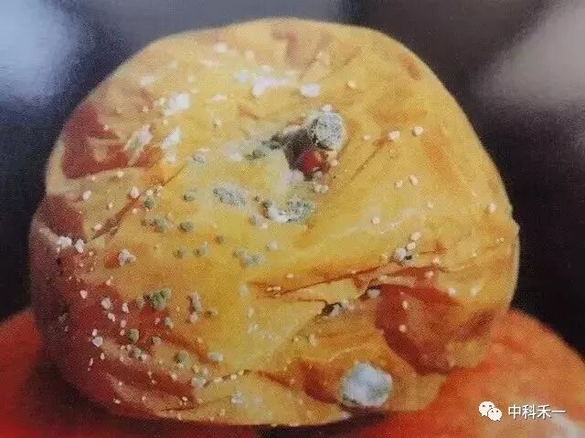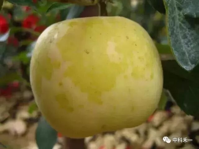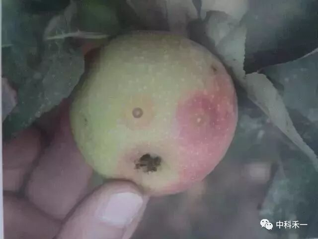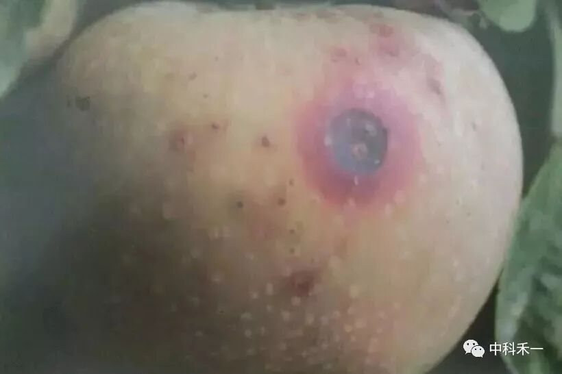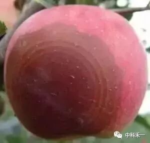 病斑形状不规则,稍凹陷,果肉稍有苦味,周围有红色晕圈,与苹果痘斑病相似。