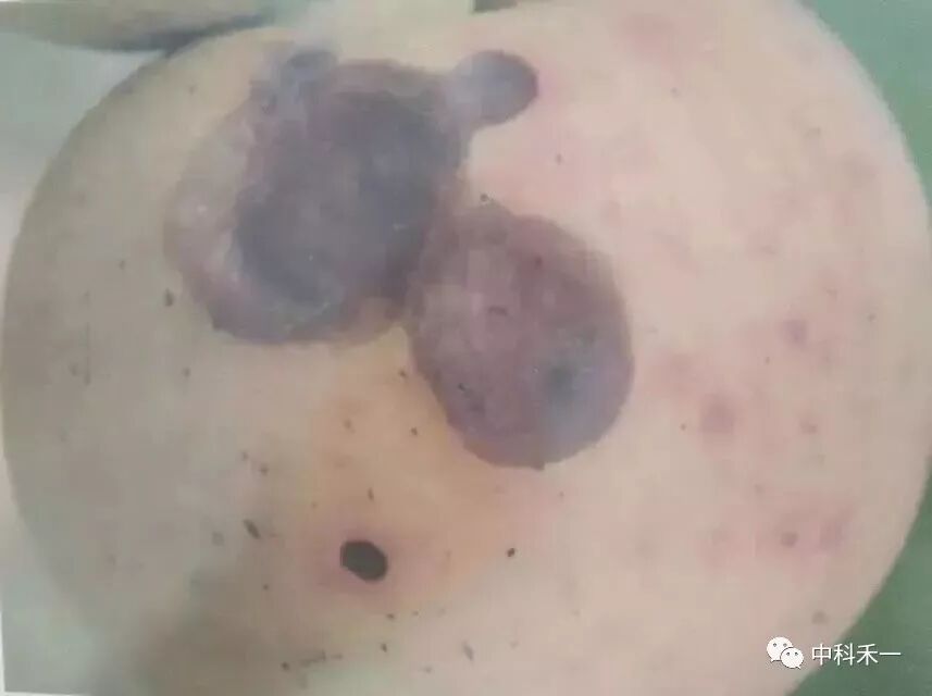 病斑很大,近圆形或不规则形,暗褐色,中心为灰白色,其上亦有小黑点,但无明显的同心轮纹。