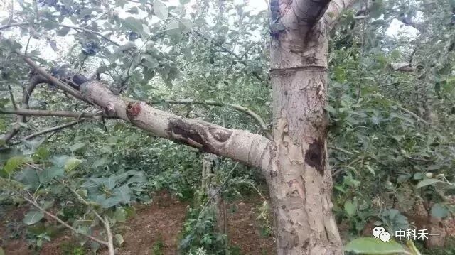 主干、大枝染病,向阳面呈不规则焦糊斑块,易遭腐烂病菌侵染,引致腐烂或削弱树势。